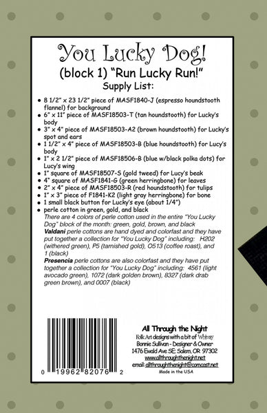 Part 1 of an 11 part Block of the Month. The 11 patterns combine to make a 43 1/2" x 48" wall hanging featuring Lucky's antics with his little blue bird friend, Lucy.
