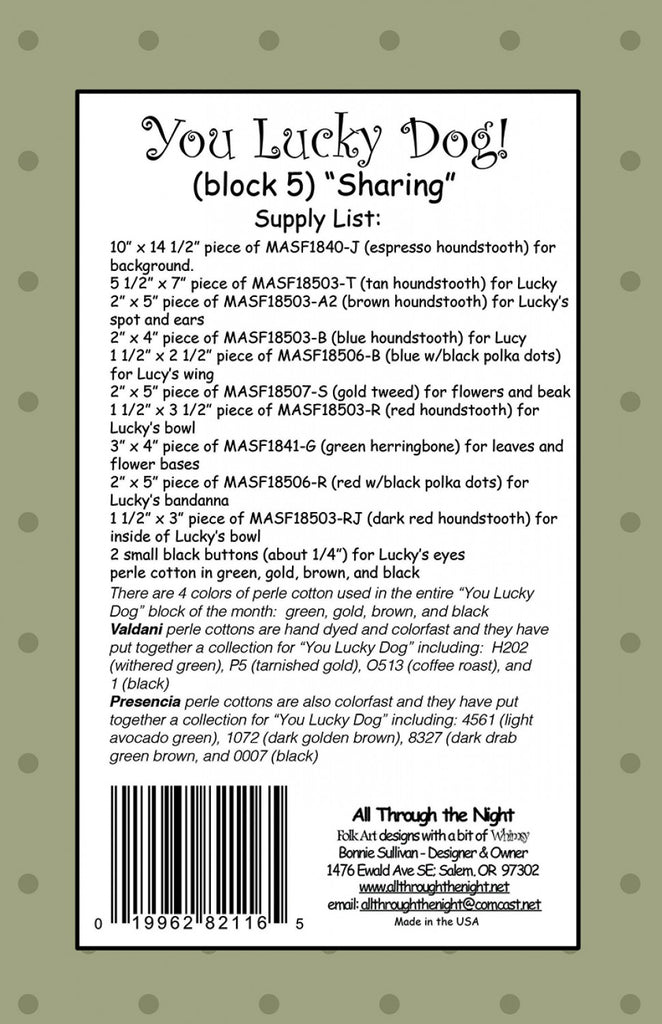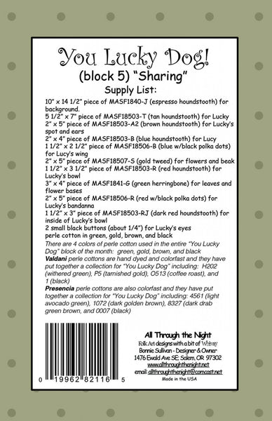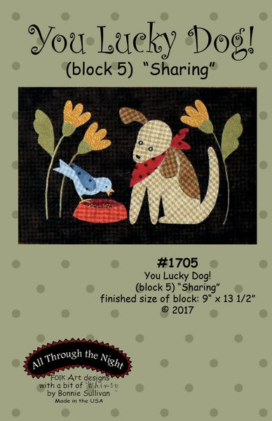 Part 5 of an 11 part Block of the Month. The 11 patterns combine to make a 43 1/2" x 48" wall hanging featuring Lucky's antics with his little blue bird friend, Lucy.