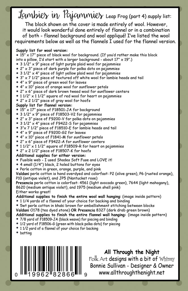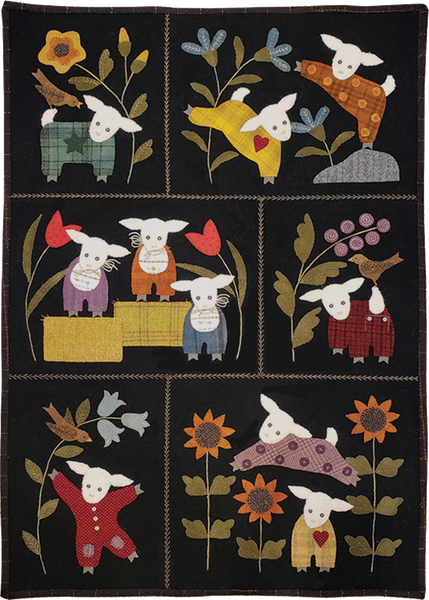 Combine all 5 Lambies in Pajammies blocks to make a 26" x 38" wall hanging. Pattern also includes directions to make a larger flannel version with patchwork sashing and borders that measures 32" x 46".