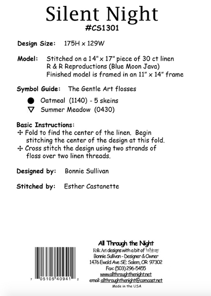 Model: Stitched on a 14" x 17" piece of 30ct linen and finished model is in an 11" x 14" frame.