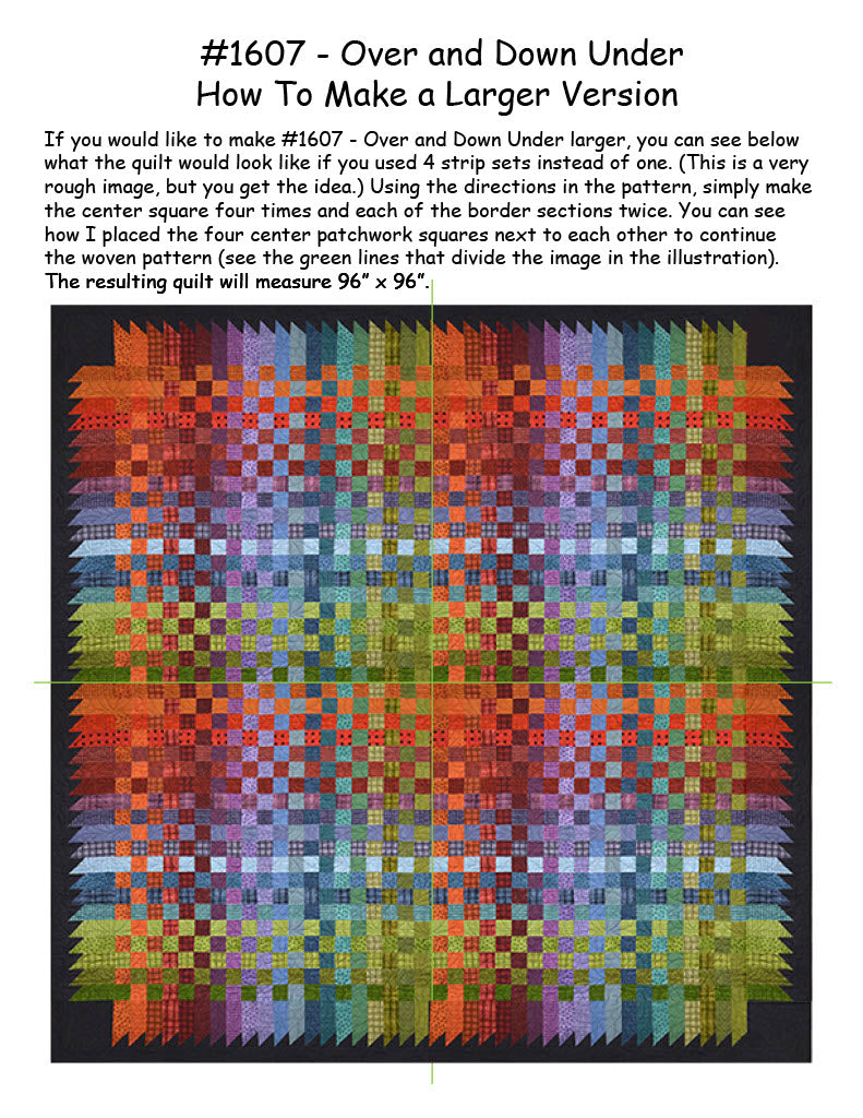 If you would like to make#1607-Over and Down Under larger, you can see below what the quilt would look like if you used 4strip sets instead of one. (This is a very rough image, but you get the idea.)Using the directions in the pattern, simply make the center square four times and each of the border sections twice. You can see how I placed the four center patchwork square next to each other to continue the woven pattern (see the green lines that divide the image in the illustration). The resulting quilt will measure 96”x96”.